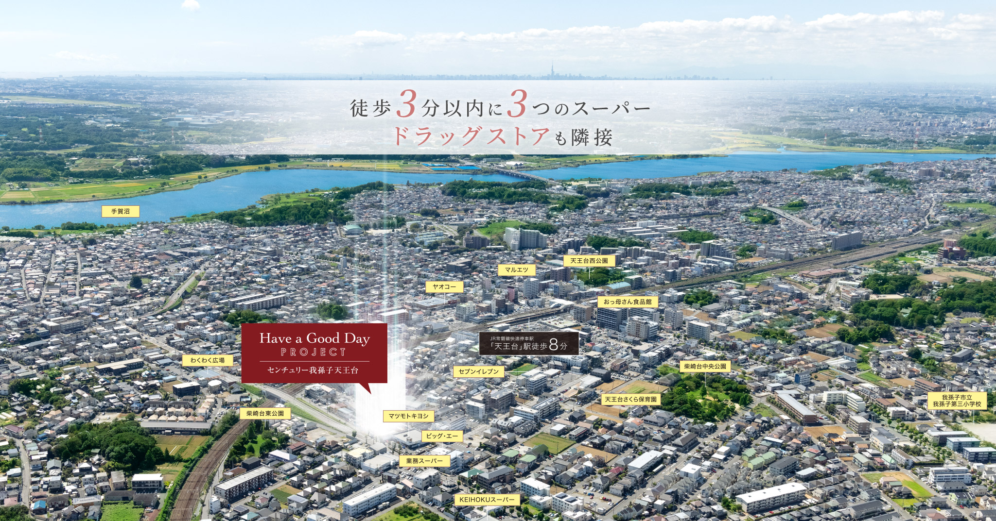 ※掲載の航空写真は計画地周辺を撮影したもの(2023年9月撮影)にCG処理を施したもので、実際とは異なります。光の柱は物件の位置を表すものであり、建物の高さ・規模を表すものではありません。また、周辺環境は将来にわたって保証されるものではありません。
