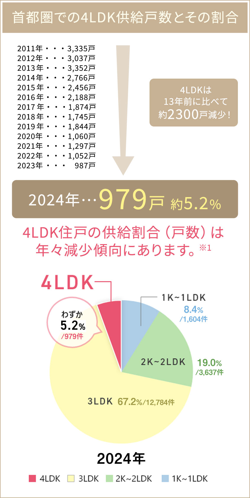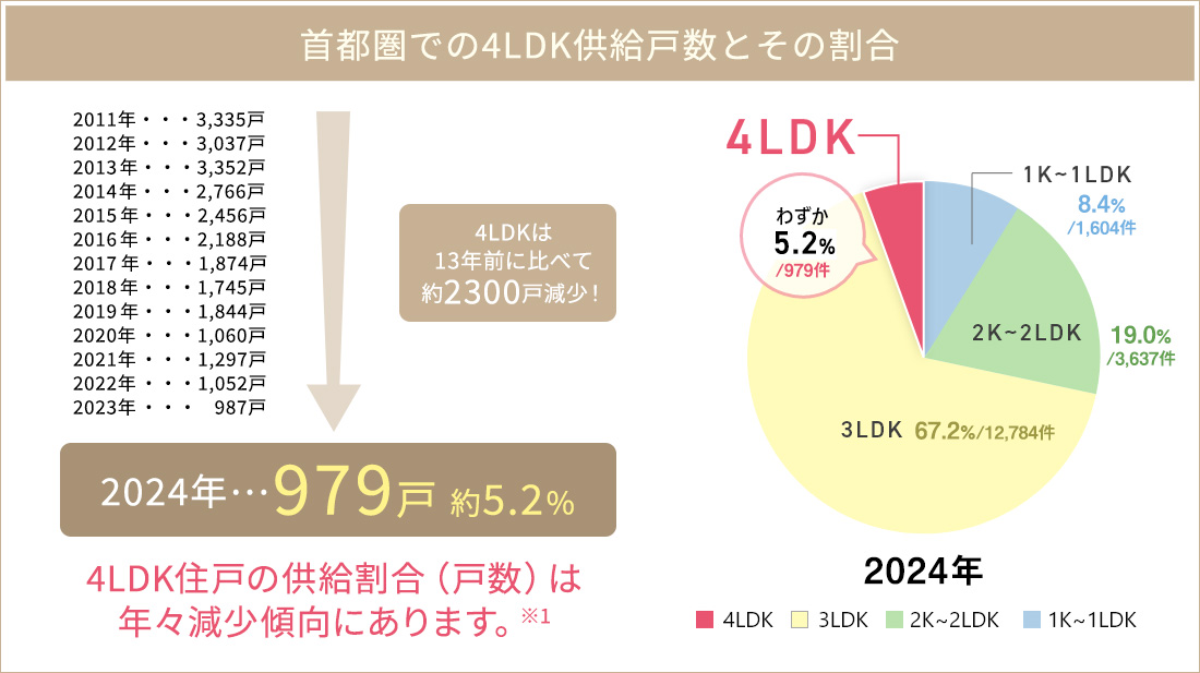 首都圏での4LDK間取りの住宅供給戸数は減少傾向にあります。