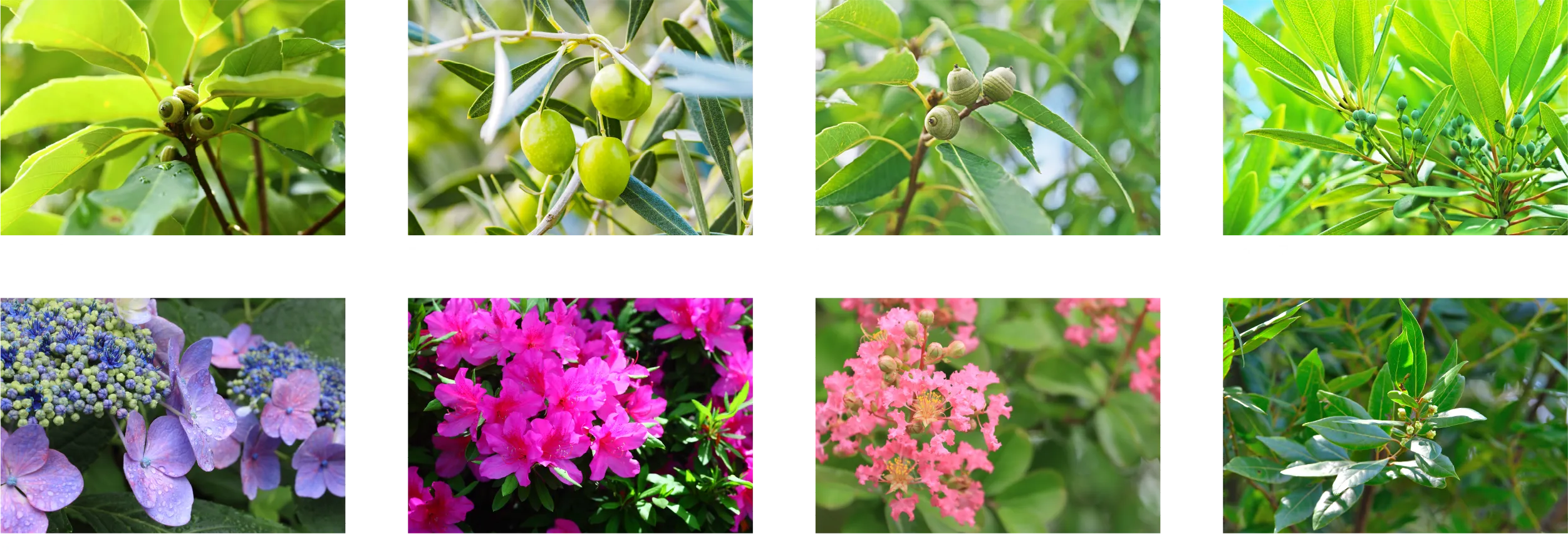 シンボルツリーとなるオリーブや、プロムナードのアラカシ、ガクアジサイやアベリアなど。
