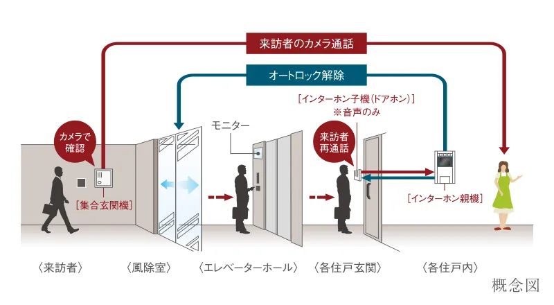 エントランスからの呼び出しに応じて、住戸内のインターホンで来訪者をチェック・確認後、オートロックを解錠するため、不審者の侵入をシャットアウトできます。各住戸の玄関でも再度音声確認できるチェックシステムなので安心です。