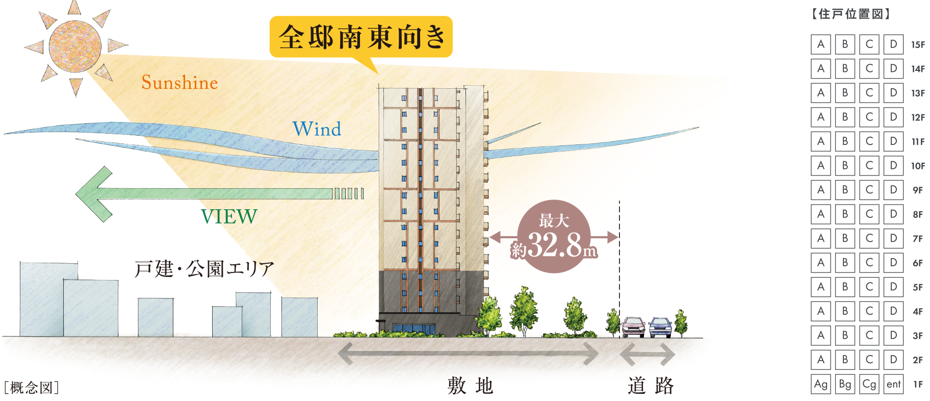※掲載の完成予想図は、計画段階の図面を基に描き起こしたもので、実際とは多少異なる場合があります。敷地の植栽の樹種、大きさについては未確定となっており、竣工時には完成予想図程度には成長致しません。植栽は特定の季節の状況を示すものではありません。なお建物外観をご覧いただくために隣地建物等を省略・簡略化しており、実際の風景とは異なります。※掲載の眺望写真は、現地15階相当の高さから撮影したもの(2024年5月)です。眺望は将来に渡って保証するものではありません。