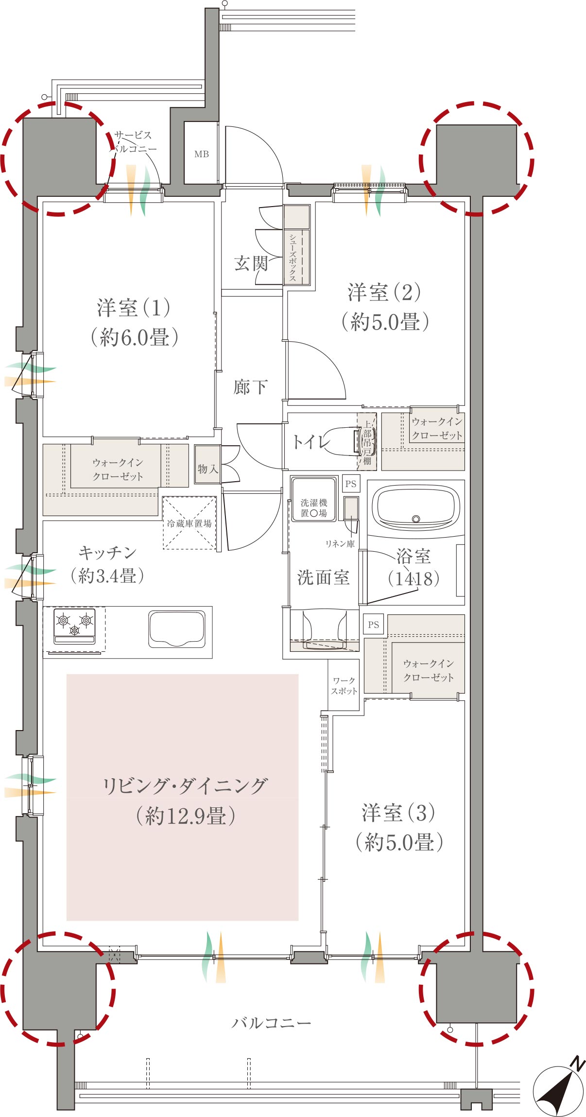 洋室3部屋のウォークインクローゼットや廊下の物入など、豊富な収納スペースをご用意しました。