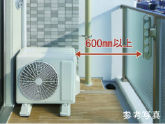 室外機設置位置 転落事故対策として足掛かりとなるものを手摺から600mm以上離しています。