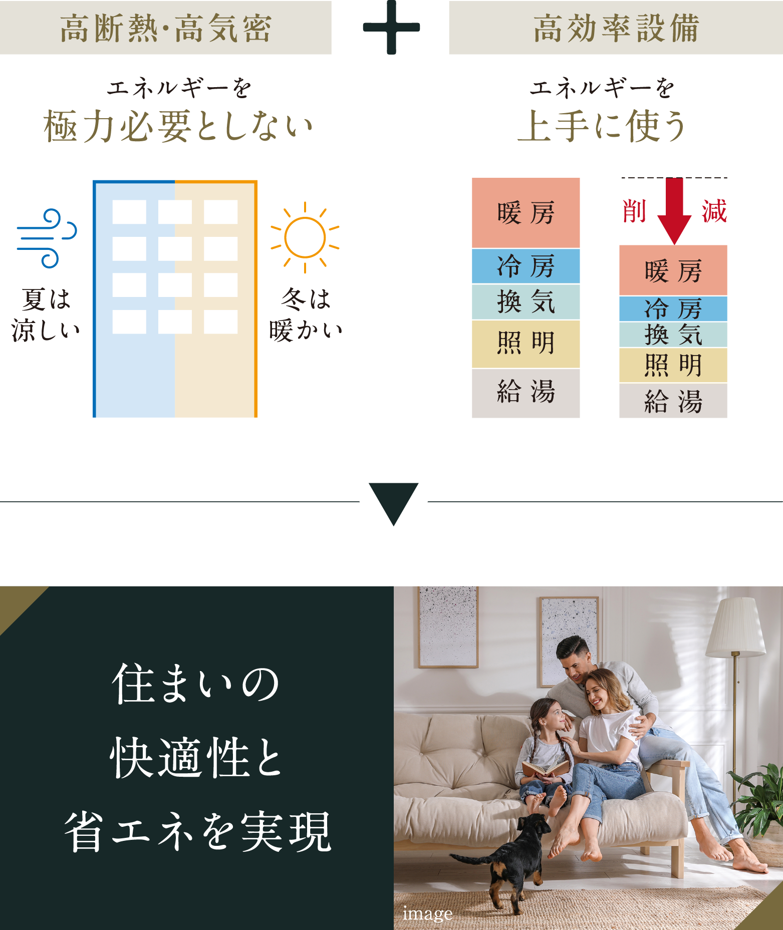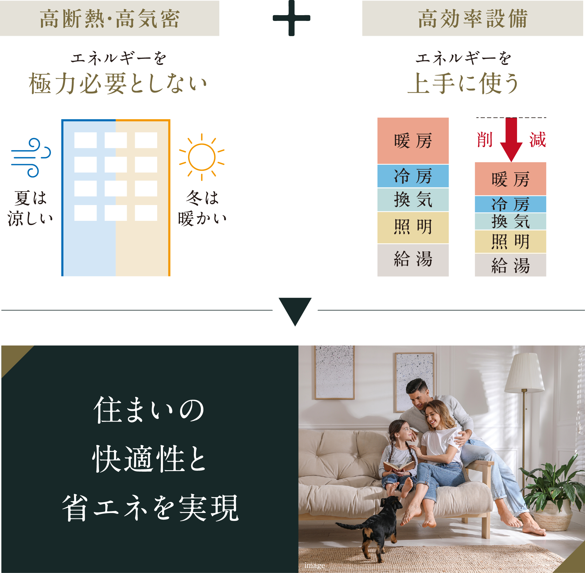 高断熱性や高効率設備により、消費エネルギーを抑制することができるため、光熱費を削減することに繋がります。